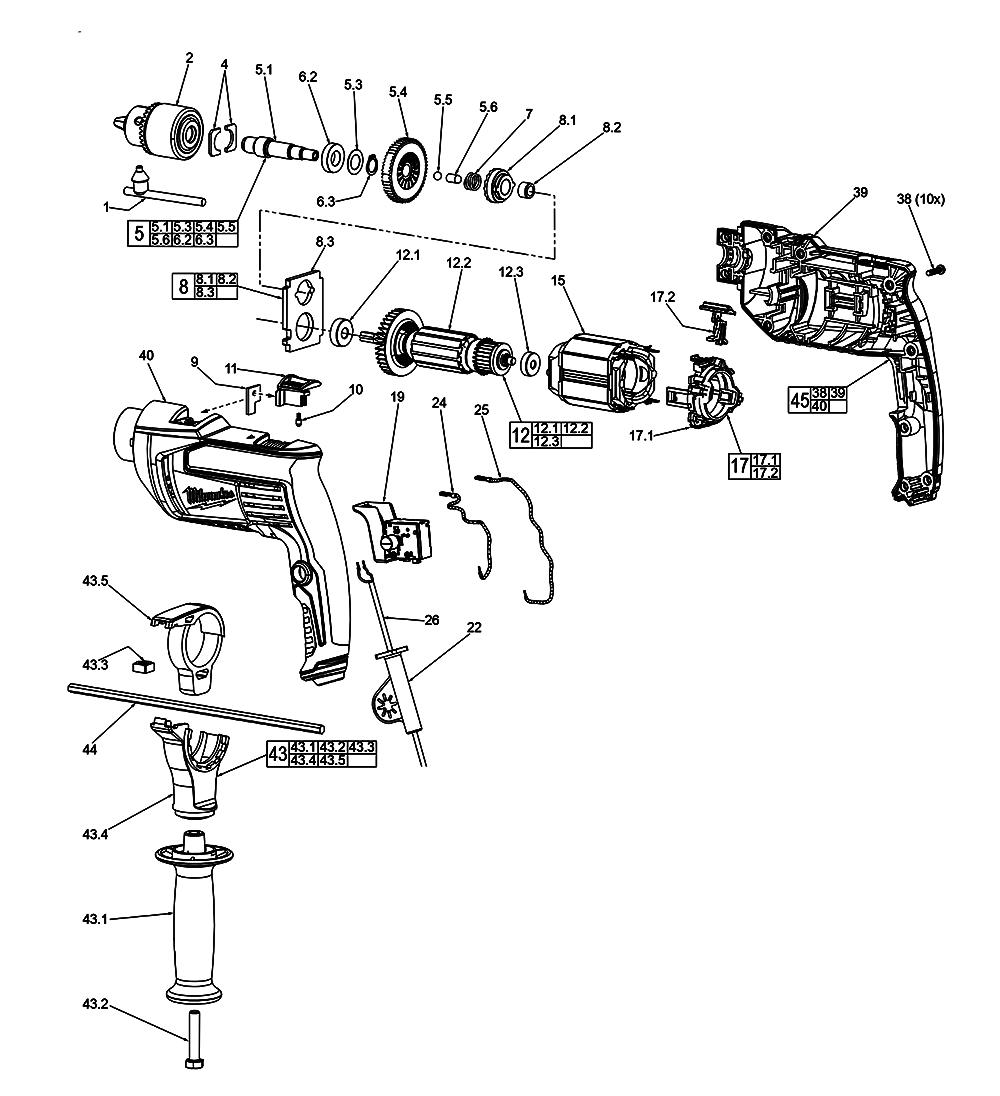 Chuck Key/5374-20 42-66-5364 1Keyless Chuck/5374-59 42-66-5365 2Seal,felt\038118/5374-59 43-44-5365 4Output Shaft Ass'y 14-29-5365 5Compress Spring,swc/5374-59 40-50-5365 7Base Plate Ratchet Ass'y 28-14-5365 8Stamping,impact Plate Spcc 43-96-5365 9Steel Cap Assembly/5374-20 44-60-5380 10Plastic,mode Selection/5374-59 31-05-5365 11Armature Ass'y 16-07-5366 12Field With Package\127v 18-07-5368 15Tension Ring R/l Ass'y 22-22-5365 17Switch,variable(vr-carbon) 23-66-5367 19Cord Protector/5374-20 44-76-5365 22Terminal(630912001)& Wire Assy 23-94-5364 24Terminal(630912001)& Wire Assy 23-94-5365 25Power Cord,brazil/chile 22-64-5360 26M4 X 16 T-20 Screw 05-88-1200 38Side Handle Ass'y With Package 14-34-5364 43Plastic,depth Gauge 038118 31-05-5367 44Housing Ass'y With Package 14-34-5365 45Ball Bearing/5380-21 02-04-5381 121Ball Bearing 5380-21 02-04-5382 123Plastic,f/r Lever Black\038118 31-44-5365 172Side Handle 31-05-5366 431