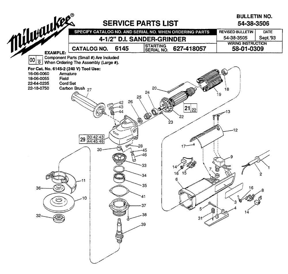 Cord Protector 44-76-0130 1Cord Set 22-64-0215 2Service Nameplate Kit 12-65-4128 3Trigger 31-92-0112 4 06-72-0815 5Service Repl Kit 14-38-0423 6Motor Housing 31-50-0425 6Rubber Ring 44-90-4245 7Left Brush Holder 22-20-0691 8Service Switch Kit 23-66-2181 9Switch 23-66-2170 9 49-12-0320 11Hover 31-15-0142 12 06-82-7270 13Carbon Brush Assembly (sold Individually) 22-18-0710 14Right Brush Holder 22-20-0692 15Brush Spring 23-52-0240 16Rubber Bumper 42-38-0181 17Ball Bearing 02-04-0848 18120 Volt Field 18-07-0055 198-16 X 2.50 Slotted Plastite T-20 06-82-7375 20120 Volt Armature 16-07-0060 21Fan 22-84-0680 22 06-82-2292 23