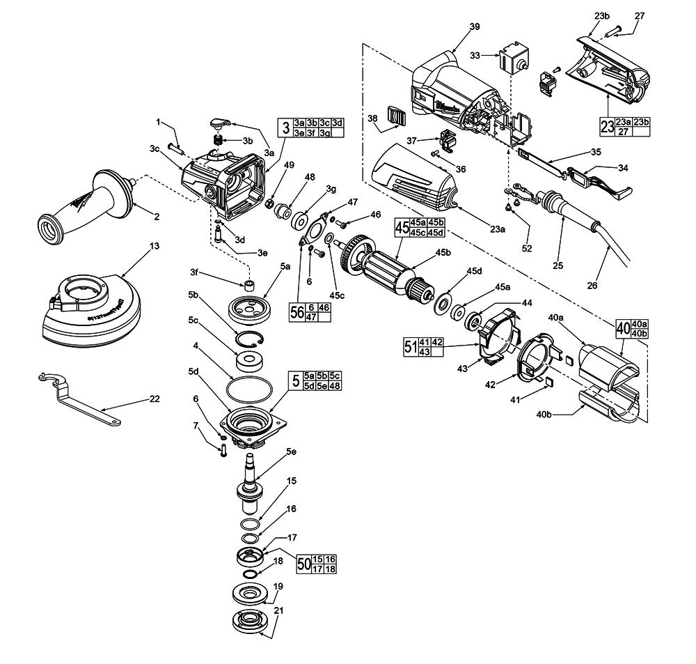 M4 X 25.4mm Pan Hd. Slt. T-20 Screw 05-88-1650 1Compact Side Handle 42-62-0120 2Gear Case Assembly 14-30-1155 3O-ring 34-40-0560 4Spindle Hub Service Kit-la 14-46-0418 5Split Washer 05-90-0225 6M4 X 14mm Pan Hd. T-20 Screw 05-88-1210 74-1/2 In T27 Guard Assembly 14-32-0210 13 43-54-0920 13Disc Flange 43-34-0935 19Flange Nut 44-40-0035 21Spanner Wrench (not Shown) 49-96-0015 22La Rear Handle Assy, Slide 14-34-6110 23Strain Relief 44-76-0095 252x1 Inmetro Cord 22-64-3435 26M4 X 28 T-20 Screw 05-88-1300 27Switch 23-66-2665 33Slide Pole - Back 31-84-0080 34Slide Pole - Front 31-84-0085 35Screw M3x8.5 Pmh T10b 05-88-0030 36Carbon Brush Assembly 230v 22-18-2245 37Slide Switch Button 31-89-0245 38Motor Housing-slide 31-50-0675 39230v Field Assy 18-04-2215 40Rubber Block For Baffle Foot 42-28-0085 41
