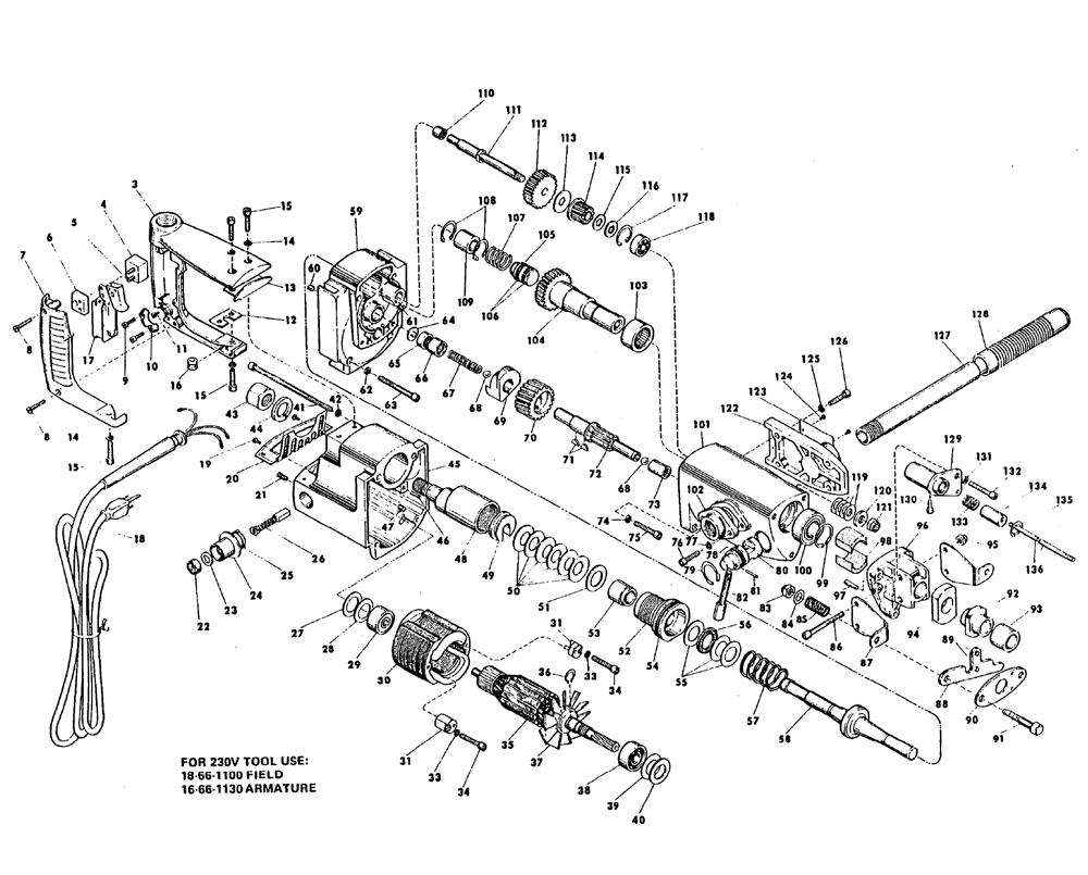 Handle 28-44-1173 3Switch Mounting Pad 44-52-0090 45/32x7/8 Dowels - Trigger Pivot Pins 06-65-1575 5Switch Mounting Pad 44-52-0100 6Handle Cover 28-20-3572 78-32 X 7/8 Oval Hd. Handle Cover Screws 06-81-3700 86-32x1/4 Ground Screw 06-81-8625 11Gasket 43-44-0200 12Front Handle Gasket 43-44-0190 131/4 Split Ring Lock Washer 06-97-4050 141/4-20x3/4 Skt. Hd. Screw 06-75-3050 15 22-90-0050 16 23-66-0490 17Cord Set 120 16 3 S 8 22-64-0395 186-32x 1/4 Hd. Rd. Sem 06-81-8650 191/4-20x1/2 Knrl. Set Sc. 06-83-2670 21Brush Retaining Screw 23-44-0100 22Brush Cap Gasket 43-44-0180 23Insulating Washer 23-86-0075 24Carbon Brush Assy. 22-18-0330 26Commutator End Washer 45-88-0490 27Flat Washer (steel) 45-88-5402 28Ball Brg. (comm. End) 02-04-0970 29