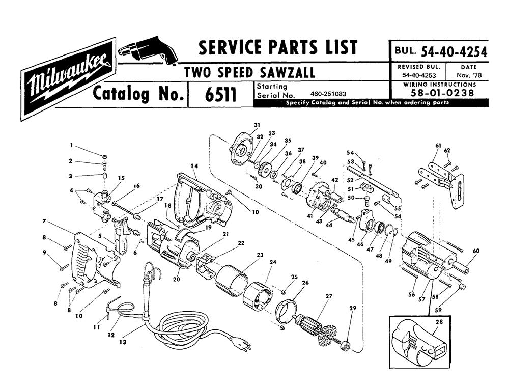 Brush Retaining Cap 23-44-0120 1Brush Spring 23-52-0160 2Carbon Brush 22-16-0255 36-32x3/8 Binding Hd. Sem 06-81-5475 46-32x3/8 Phillips Pan Hd. Sem 06-81-5477 4Switch 23-66-0751 51106 Drill 14-46-0751 56-32x1/4 Ground Screw 06-81-8625 6R.h. Half D Handle 31-44-0325 7R.h. Half D Handle 31-44-0326 78-32x314 Pan Hd. Screw 06-81-0402 88-32x3/4 Pan Hd. Screw 06-81-0400 88-32x1 Pan Hd. Screw 06-81-0472 98-32x1 Slot Pan Hd Torx 06-82-2362 98-32 X 1/2 Pan Sl Ph Hd Screw 06-81-0047 10 49-96-0070 11Chuck Key Holder 48-66-4080 12 22-64-4100 13L.h. Half D Handle 31-44-0321 14Brush Holder Assembly 22-22-1380 15Brush Holder Assembly 22-22-0300 158-32 X 2-3/16 Field Bolt 06-81-1055 168-32 X 2 19 Field Bolt 06-81-1058 16Insulating Spacer 31-86-0120 176x1/4 Rd. Hd. Type Z Screw 06-85-0200 18