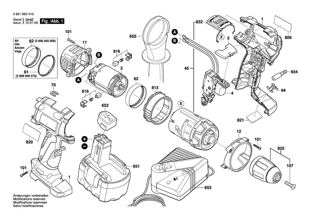 Housing Section Blue 2-605-105-101 1Dc Motor 2607022319 2Electronics Module 2-607-230-121 4Adjusting Lever Red 2-601-099-155 5End Cap Black 2-600-508-064 11End Cap 2600510011 12Planetary Gear Train 2-606-200-254 45 2600202067 62Pickup Clip 2601250009 70Spring Element 2-604-690-043 94Torx Oval-head Screw 2603490018 101Countersunk-head Screw 2603421229 107Accumulator Battery 2607335669 651Protective Cap 2 609 100 101 652Battery Charger 2607225033 653Holder 2610917319 654Auxiliary Handle 2602025158 655Manufacturer's Nameplate 2-601-115-016 809Cap-handle 2600510012 813Carbon-brush Set Replaces 2607034901 2607034904 816Reference Plate 2-601-115-359 820Nameplate 2-601-115-017 821Keyless Chuck 2608572902 825 2601099213 832