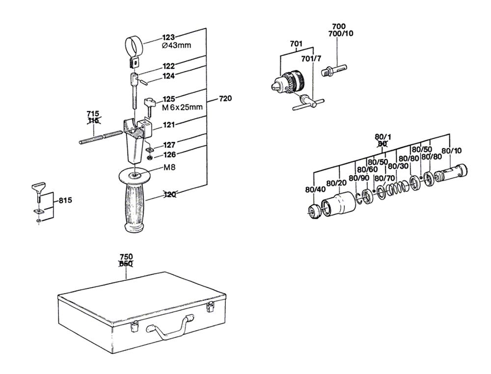 Motor Housng 1615108008 1Pole Shoe 115v 1 614 220 069 2On-off Switch 2 607 200 134 4Power Supply Cord 1 614 460 010 5Power Supply Cord 3 604 460 555 5Grommet Ø7,9-ø12x120 Mm 3-600-703-011 6Fastening Clamp 1-601-302-014 7Manufacturer's Nameplate 1 611 110 130 9Manufacturer's Nameplate 1 611 110 155 9Housing Cover 1615500277 15Air Deflectr 1615820059 16Fan 2 606 610 059 17Bearing Pedestal 1 615 820 058 18Guide Tube 1 615 806 031 20Drilling Spindle 1 618 597 030 21Piston 1618700045 23Striker Pin 1 618 710 040 24Piston Pin 1613105012 25Sealing Cap 1 615 500 278 31Spacer 1610329000 32Washer 1610101611 33Sealing Frame 1 611 015 022 34Knob 1612026017 35Holding Spring 1 614 680 002 36Gasget 1611031004 37