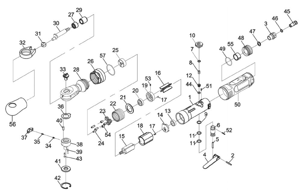 Housing JSM3330-01 1Spring Pin (3x20l) JSM3330-02 2Air Inlet JSM3330-03 3Throttle Lever JSM3330-04 4Throttle Valve JSM3330-05 5Bushing JSM3330-06 6O-ring (6.5x1.5) JSM3330-07 7Spring JSM3330-08 8O-ring (11.4x1.25) JSM3330-09 9Knob JSM3330-10 10O-ring (10.7x1.5) JSM3330-11 11Throttle Valve JSM3330-12 12Ball Bearing BB-696ZZ 13Rear End Plate JSM3330-14 14Rotor SM-30115 15Vane ** SM-30116 16Pin SM-30117 17Cylinder Jsm-501 50118 18Front End Plate JSM3330-19 19Ball Bearing BB-608ZZ 20Washer SM-30121 21Thread Ring Gear SM-30122 22Idler Gear JSM3330-23 23Idler Gear Pin SM-30124 24Pin, Ø4 X 13.8l 30124 24Idler Gear Plate SM-30125 25Clamp Nut JSM3330-26 26Needle Bearing JSM3330-27 27Ratchet Housing JSM3330-28 28Bushing SM-30129 29Crank Shaft JSM3330-30 30Drive Bushing JSM3330-31 31Yoke JSM3330-32 32Reverse Button JSM3330-33 33Spring JSM3330-34 34Lock Pin JSM3330-35 35Washer * SM-30136 36Ratchet Pawl * SM-30137 37Ratchet Anvil 3/8" SM-30138 38Spring SM-30139 39Pin SM-30140 40"thrust Washer 3/8""" JSM3330-41 41Retainer Ring SM-30142 42Steel Ball ** SB-5/32 43O-ring (3.8x1.9) JSM3330-44 44Fixed Shaft JSM3330-45 45O-ring (7.5x1.5) JSM3330-46 46Washer JSM3330-47 47Deflector JSM3330-48 48O-ring (26.7x1.78) JSM3330-49 49Grip JSM3330-50 50Spring Pin (2.5x6l) JSM3330-51 51Spring Pin (2x12l) JSM3330-52 52Spring Pin 70117 53Bushing JSM3330-54 54Damping Material JSM3330-55 55Rubber Cap JSM3330-56 56O-ring (29.4x3.1) JSM3330-57 57