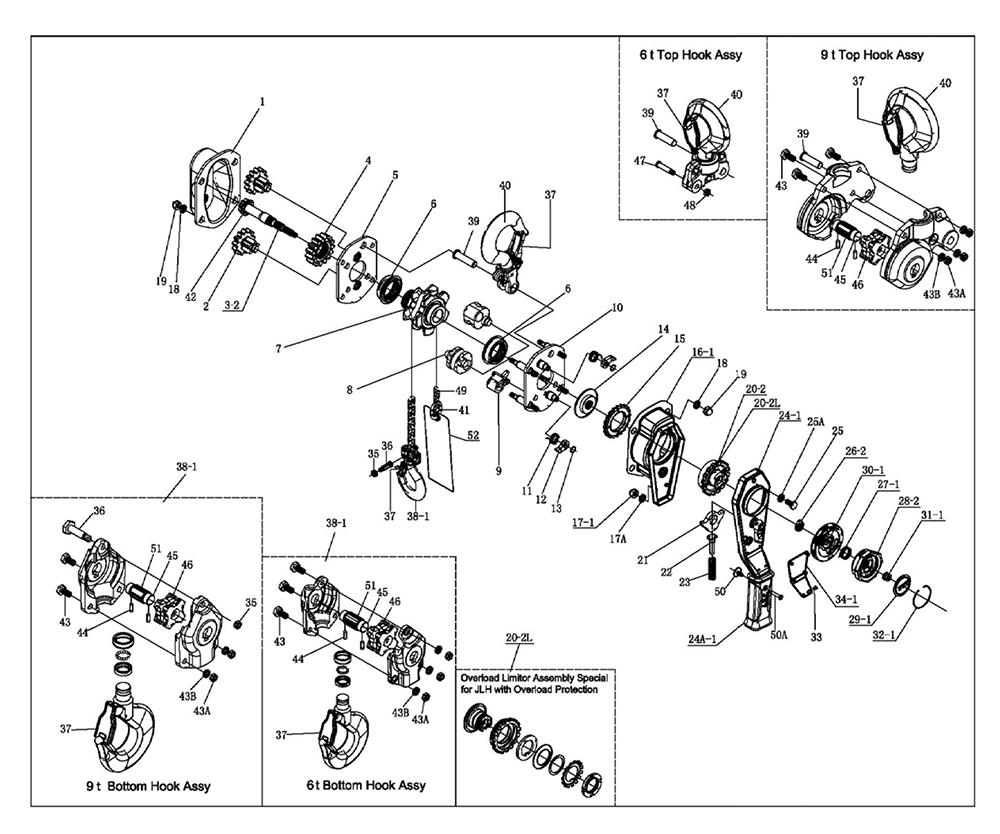 Gear Case Assembly (0.75, 1 Ton) JLH80-1G 1Spur Gear Assembly (08, 1 Ton) (include Multiple Parts) JLH80-2 2Load Gear (08, 1 Ton) JLH80-4 4Gear Side Plate Assembly (08, 1 Ton) (include Multiple Parts) JLH80-5 5Caged Roller Bearings (08, 1 Ton) JLH80-6 6Load Sheave (08, 1 Ton)) JLH80-7 7Guide Roller (08, 1 Ton) JLH80-8 8Stripper (08, 1 Ton) JLH80-9 9Lever Side Plate Assembly (08, 1 Ton) (include Multiple Parts) JLH80-10 10Pawl Spring (08, 1 Ton) JLH80-11 11Pawl (08, 1, 16 Ton) JLH160-12 12Snap Ring (08, 1, 16 Ton) JLH160-13 13Disc Hub (08, 1, 16, 25 Ton) JLH160-14 14Ratchet Disc (08, 1, 16, 25 Ton) JLH160-15 15Lock Washer (0.75, 1, 1.5, 2.5 Ton) 6mm JLH160-17AG 17Lock Washer (08 To 9 Ton) JLH80-18G 18Acorn Nut (08 To 9 Ton) JLH80-19G 19Change Over Pawl (08, 1, 16, 25 Ton) JLH160-21 21Spring Shaft (08, 1, 16, 25 Ton) JLH160-22 22Spring (08, 1, 16, 25 Ton) JLH160-23 23Lock Washer (0.75 To 9 Ton) M6 X 12 JLH160-25G 25Lock Washer (0.75, 1, 1.5 Ton) 6mm JLH160-25AG 25"driving Shaft (0.75t, 1t)" JLH80-3-2 32Rivet (08 To 9 Ton) JLH80-33 33Lock Nut F001753 35Bottom Hook Shaft (08, 1 Ton) JLH80-36 36Safety Latch Kit 0.8t (s/n 092221 And Higher) JLH80-37-1 37Bottom Hook Holder Assembly (incls 35 & 36) With Thrust Bearing (models From 09-15-2009 And Forward)(include Multiple Parts) JLH80-38-1 38Top Hook Shaft (08, 1 Ton) JLH80-39 39Replaces Jlh80-40 - Top Hook Assembly 0.8t (... JLH80-40-1 40Chain Stop (08, 1 Ton) JLH80-41 41Drive Shaft Washer (08, 1 Ton) JLH80-42 42Load Chain (08, 1 Ton) Ñ Specify Length JLH80-49 49Rubber Grip Fastening (08, 1, 16, 25 Ton) JLH160-50 50Fastening Screw (08, 1, 16, 25 Ton) JLH160-50A 50Warning Tag (not Shown) L100-WT 52Brake Cover Assembly (0.75t, 1t) 8mm JLH80-16-1 161Acorn Nut (075, 1, 15, 25 Ton) JLH160-17G 171Change Over Gear (0.75t, 1t, 1.5t, 2.5t JLH160-20-2 202Overload Limiter Assembly JLH80-20L-2 202Lever Handle Assembly (0.75t, 1t, 1.5t, JLH80-24-1 241Rubber Grip (0.75t, 1t, 1.5t, 2.5t) JLH80-24A-1 241Stop Knob (0.75t, 1t, 1.5t, 2.5t) JLH160-26-2A 262Twisting Spring (0.75t, 1t, 1.5t, 2.5t) JLH160-27-1 271Hand Wheel Assembly (0.75t, 1t, 1.5t, 2 JLH160-28-2 282Hand Wheel Cap (0.75t, 1t, 1.5t, 2.5t) JLH160-29-1 291Hand Wheel Base Assembly (0.75t, 1t, 1. JLH160-30-1 301Lock Nut F001754 311Steel Cable Ring (0.75t, 1t, 1.5t, 2.5t JLH80-32-1 321Nameplate Jlh-75 LM000191 341