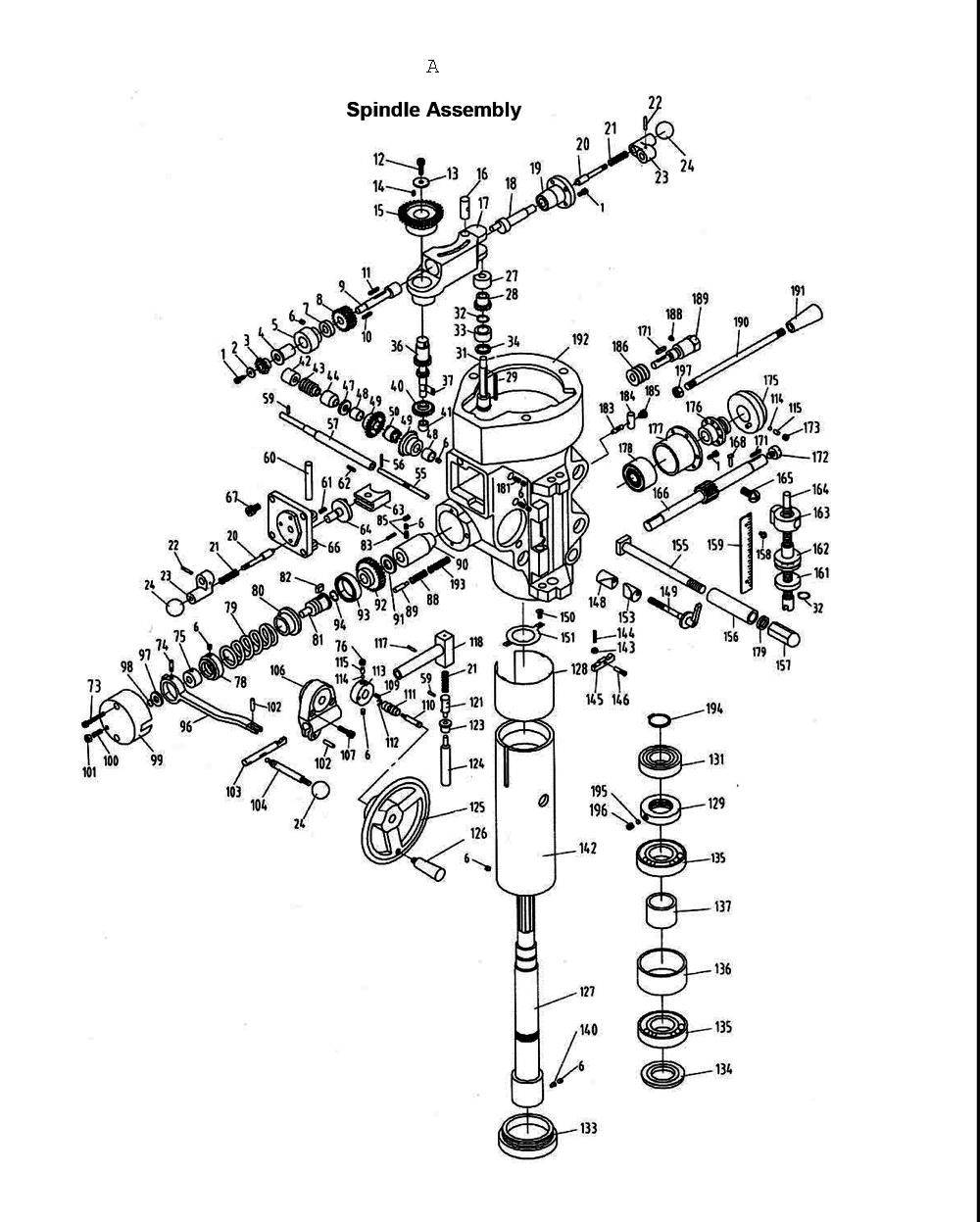 Upper Housing VS-001 1Motor Pulley VS-002 2Motor Pulley Bushing (not Shown) VS-044A 2Socket Head Cap Screw TS-1503011 3Belt VS-004 4Motor Pulley Disk VS-005 5Motor Pulley Shaft VS-006 6Key KEY7725 7Motor Pulley Spring VS-008 8Spring Stop Washer VS-009 9Spring Pin LS-009 11Motor Pulley Cover VS-011A 11Socket Head Cap Screw TS-1502051 12Cover VS-013 13Socket Head Cap Screw TS-1503041 14Ball Bearing BB-6007ZZ 15Dial Cover VS-016 16Socket Head Cap Screw TS-1503071 17Socket Head Cap Screw TS-1503041 18Bushing VS-019 19Bushing VS-020 20Worm VS-021 21Worm Gear VS-022 22Spring Pin VS-023 23Bushing VS-024 24Dial Control Shaft VS-025 25Spring Pin VS-026 26Dial Wheel VS-027 27Wheel Handle VS-028 28Shaft VS-029 29Spring Pin VS-030 30Spring Pin VS-031 31Speed Change Chain VS-032 32Adjustment Stud VS-033 33Sleeve Nut VS-034 34Adjustment Stud VS-035 35Tilter VS-036 36Bushing VS-037 37Key KEY6645 38Regulating Screw VS-039 39Spring Pin VS-040 40Washer VS-041 41Support VS-042 42Ball Bearing BB-6010VV 43Driven Pulley Assembly (s/n:xxx1944 & Lower) VS-044 44Driven Pulley Assembly (s/n:xxx1945 & Higher) VS-044N 44Steady Pulley (s/n:xxx1944 & Lower) VS-045 45Bearing Cover VS-046 46Brake Lining VS-047 47Lock Screw VS-048 48Brake Spring VS-049 49Lower Housing Cover VS-050 50Socket Head Cap Screw TS-1504031 51Brake Shaft Sleeve VS-052 52Brake Lock Shaft VS-053 53Brake Lock Block VS-054 54Socket Head Cap Screw TS-1503061 55Brake Lock Handle VS-056 56Plastic Ball VS-057 57Plastic Ball LB-017 57Brake Finger Pivot Stud VS-058 58Brake Stud VS-059 59Snap Ring VS-060 60Hex Nut TS-0561072 61Timing Belt Pulley VS-062 62Timing Belt VB-225L100 63Bearing Retainer VS-064 64Ball Bearing BB-6203ZZ 65Bull Gear VS-066 66Counter Shaft VS-067 67Key VS-068 68Key VS-069 69Spindle Pulley Hub VS-070 70Key VS-071 71Key VS-072 72Spindle Gear Hub VS-073 73Spindle Gear Assembly VS-074 74Rack Cup VS-075 75Washer VS-076 76Ball Bearing BB-6908ZZ 77Bearing Washer VS-079 78Bearing Washer VS-078 78Bearing Washer VS-079 79Snap Ring VS-080 80Nut VS-081 81Lower Housing VS-082 82Fixed Clutch Bracket VS-083 83Spring VS-084 84Stud VS-085 85Socket Head Cap Screw TS-1506021 86Gear Shift Pinion VS-087 87Pin VS-088 88Detent Plate VS-089 89Detent Washer VS-090 90Spring VS-091 91Pinion Block VS-092 92Socket Head Cap Screw TS-1503011 93Pinion Crank VS-094 94Cap Nut VS-095 95Hex Nut TS-0561031 96Snap Ring VS-097 97Wave Washer VS-098 98Plastic Ball VS-099 99Snap Ring VS-100 100Cover VS-101B 101Spring Shaft VS-102 102Washer VS-103 103Copper Washer VS-104 104Screw VS-105 105Shaft VS-107 106Socket Head Cap Screw TS-1504061 107Lock Washer VS-109 109Hex Nut TS-1540041 110Hex Nut TS-2311061 110Socket Head Cap Screw TS-0209051 111Motor VS-000 112Oval Head Screw VS-113 113Draw Bar JTM1-001VS 114Draw Bar Washer JTM4VS-A002B 115Key VS-116 116Oval Head Screw VS-117 117Snap Ring VS-007 118Plastic Sleeve VS-005A 119Key VS-120 120Bearing BB-6206ZZ 121