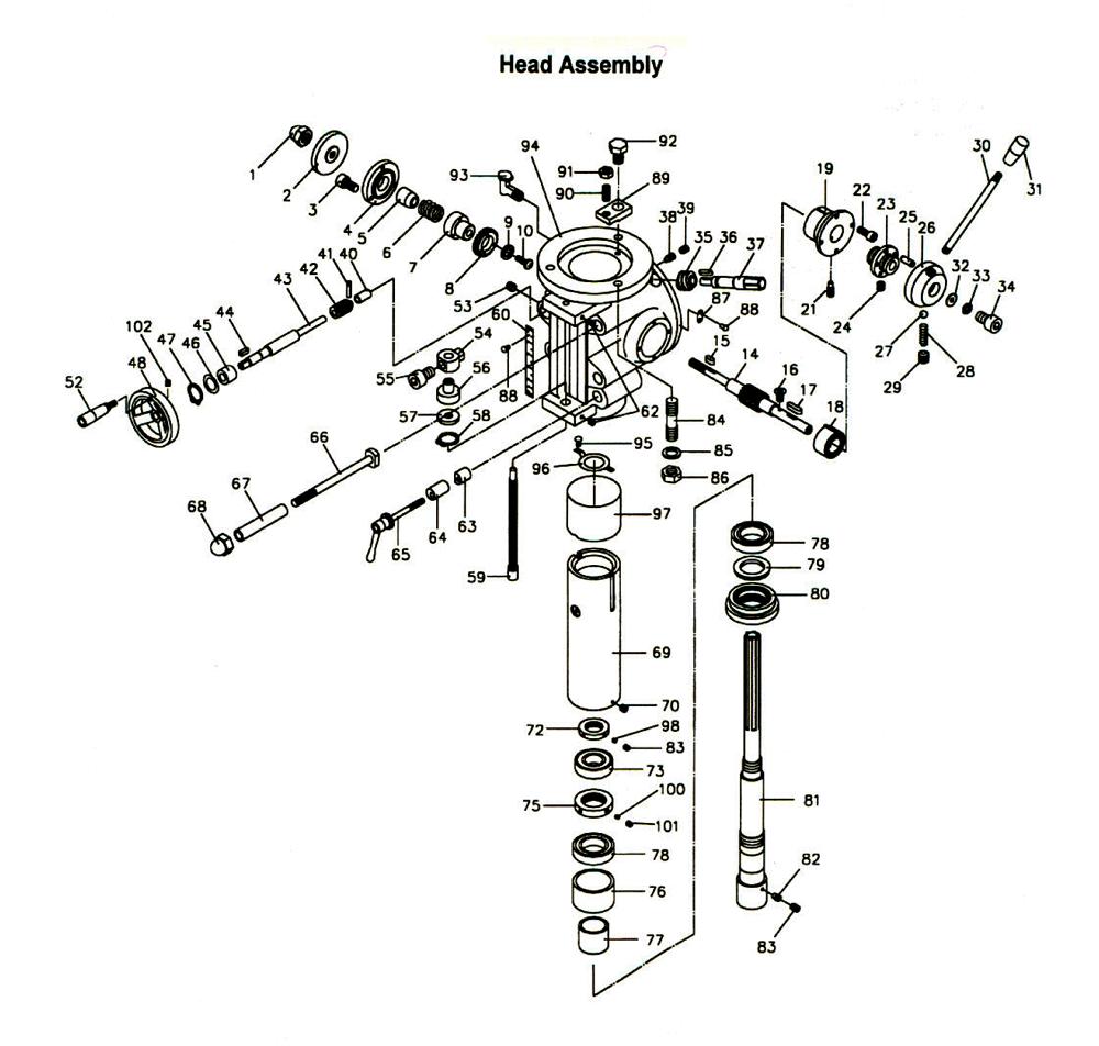 Castle Nut JVM836-01 1Lock Nut JVM836-02 2Transmission Sleeve JVM836-23 2Socket Set Screw TS-1523041 3Cover JVM836-04 4Taper Sleeve JVM836-05 5Spring JVM836-06 6Transmission Sleeve (s/n: 307xxxx & Lower) JVM836-07 7Worm Gear JVM836-08 8Spring Washer JVM836-09 9Cross Head Screw (s/n: 307xxxx & Iower) JVM836-10 10Shaft JVM836-14 14Key JVM836-15 15Cross Flat Head Screw JVM836-16 16Key (5x5x20) PM2700-522 17Whitney Key JVM836-17 17Volume Spring JVM836-18 18Spring Bracket JVM836-19 19Set Screw TS-1524011 21Flat Hexagon Screw TS-1514021 22Set Screw TS-1524011 24Round Pin JVM83625 25Handle Base JVM836-26 26Steel Ball JVM836-27 27Spring JVM836-28 28Set Screw TS-1524011 29Rocket Rod JVM836-30 30Knob JVM836-31 31Flat Washer JVM836-32 32Spring Washer JVM836-33 33Hex Socket Cap Screw JVM836-34 34Worm JVM836-35 35Whitney Key JVM836-36 36Worm Shaft JVM836-37 37Full Dog Point Set Screw JVM836-38 38Socket Set Screw TS-1522011 39Bushing JVM836-40 40Spring Pin (serial # 307xxxx And Lower) JVM836-41 41Worm JVM836-42 42Shaft JVM836-43 43Flat Key JVM836-44 44Bushing JVM836-45 45Spacer JVM836-46 46C-retaining Ring JVM836-47 47Wheel JVM836-48 48Hand Grip JVM836-52 52Socket Set Screw TS-1523041 53Locating Block JVM836-54 54Hex Socket Cap Screw JVM836-55 55Graduated Ring JVM836-56 56Graduated Tight Nut JVM836-57 57C-retaining Ring JVM836-58 58Screw JVM836-59 59Graduated Scale JVM836-60 60Set Screw TS-1524011 62Tight Collar JVM836-63 63Tight Collar JVM836-64 64Flexible Handle JVM836-65 65T-head Solt JVM836-66 66Sleeve Plpe JVM83667 67Castle Nut JVM836-68 68Rack Sleeve JVM836-69 69Cone Point Set Screw JVM836-70 70Nut JVM836-72 72Bearing BB-6206 73Nut JVM836-75 75Spacer JVM836-76 76Spacer JVM836-77 77Angular Ball Bearing ABB7008 78Protection Ring JVM836-79 79Protection Cover JVM836-80 80Spindle Shaft JVM836-81 81Full Dog Point Set Screw JVM836-82 82Socket Set Screw TS-1522011 83Stud JVM836-84 84Washer TS-1550081 85Hex Nut TS-1540081 86Limit Plate JVM836-87 87Rivet _ JVM836-88 88Stop Block JVM836-89 89Socket Set Screw TS-1523041 90Hex Nut TS-1540041 91Hex Nut TS-2311061 91Hex Screw TS-41490011 92Oil Can JVM836-93 93Head Body JVM836-94 94Cross Round Cap Screw JVM836-95 95Plate JVM836-96 96Cover JVM83697 97Aluminum Block JVM836-98 98Aluminum Block JVM836-100 100Set Screw JVM836-101 101Set Screw JVM836-102 102