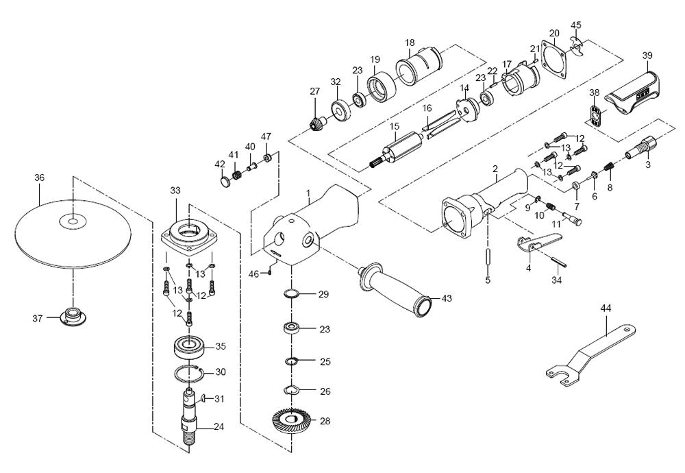 Motor Housing JAT741-01 1Valve Housing JAT741-02 2Air Inlet JAT741-03 3Throttle Lever JAT452-04 4Valve Pin JAT741-05 5Valve JAT741-06 6Valve Seat JAT741-07 7Spring JAT741-08 8E-ring Etw-4 JAT741-09 9Spring JAT741-10 10Throttle Lock JAT741-11 11Screw M5x22l JAT741-12 12"lock Washer TS-2361051 13End Plate JAT741-14 14Rotor JAT740-15 15Rotor Vane 4pcs JAT450-16 16Exhaust Deffector JAT741-17 17Cylinder JAT741-18 18Front End Plate JAT741-19 19Gasket JAT741-20 20Spring Pin 3x6l JAT741-21 21Spring Pin 40317-13 22Ball Bearing BB-608ZZ 23Spindle 5/8in-11 JAT741-24 24Retaining Ring Stw JAT741-25 25Wave Washer Ww-16 JAT741-26 26Pinion Gear JAT740-27 27Bevel Gear JAT740-28 28Spacer JAT740-29 29Retaining Ring Rtw JAT741-30 30Key 3x13 JAT450-34 31Bearing BB-6201Z 32Spindle Cap JAT740-33 33Spring Pin 4x25l JAT741-34 34Ball Bearing 6203z JAT741-35 35Back Disc 5/8in-11 JAT741-36 36Disc Nut 5/8in-11 JAT741-37 37Exhaust Diffuser JAT741-38 38Rubber Grip JAT741-39 39Shaft JAT741-40 40Spring JAT741-41 41Spindle Lock JAT741-42 42Dead Handle JAT450-54 43Pin Wrench JAT741-44 44Motor Gasket JAT741-46 45Set Screw M4x4l JAT741-47 46Bushing JAT740-48 47