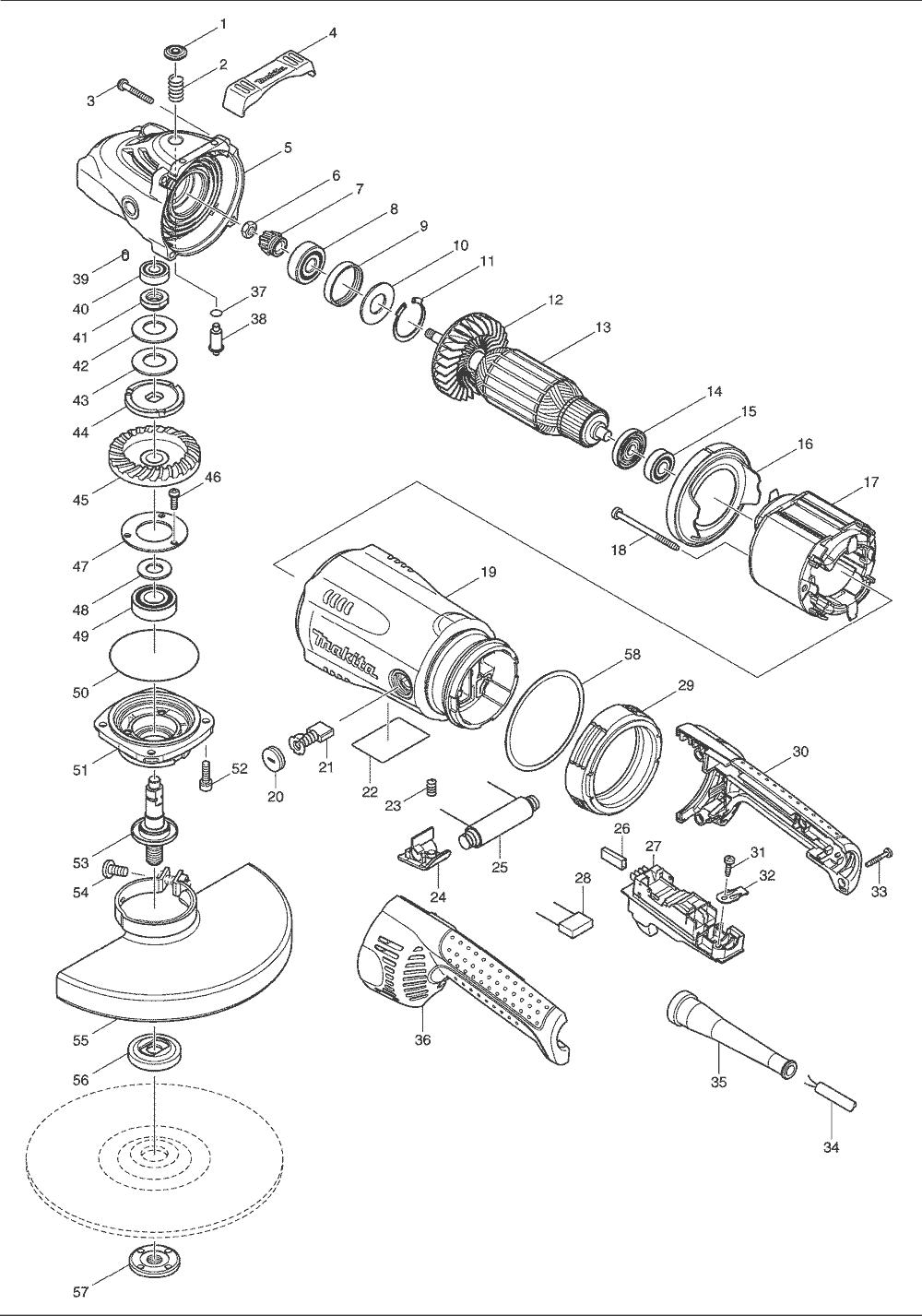 Pin Cap, Ga7021 419133-4 1Compression Spring 12, 9060l 233292-8 2Tapping Screw 5x35, 5477nb 266373-3 3Tapping Screw 5x35, Hr160dh 266012-5 3Bumper, Ga7021 419144-9 4Gear Housing Cpl.,ga7021 142754-4 5Gear Housing Cpl.,ga7021 154685-5 5Hex. Nut M8, Ga7021 252194-9 6Spiral Bevel Gear 12, Ga7021 227490-4 7Ball Bearing 6301ddw, 9040l 211132-0 8Replacement Ball Bearing - 2 X Shield, Id 12mm X Od 37mmx W 12mm Bosch 1610900015, Makita 211132-0 (2pcs/pk) SE 6301ZZ-D 8Rubber Ring 38, Ga7021 262085-6 9Flat Washer 20, Ga7021 267299-2 10Retaining Ring R-42, Ga7021 962211-4 11Fan 80, Ga7021 240081-4 12N/a 517831-5 13Armature Ass'y 115v, Ga9040s 516956-2 13Insulation Washer 10, Ga7021 681630-2 14B. Bearing 6200ddw, Jr3000v 211087-9 15Baffle Plate, Ga7021 419135-0 16N/a 526196-4 17Field Ass'y 110-115v, Ga9040s 520052-0 17T. Screw, Flange 5x75,2414b 266059-9 18Motor Housing Cpl.,ga9040s 158083-5 19Brush Holder Cap, Ga7021 643700-5 20Carbon Brush Set, 194992-4 CB204 21Order Cb-204 Carbon Brush Set,hm1800 194992-4 21Aftermarket Japanese Carbon Brush Set Replace... K33A 21Name Plate, Ga9040s 862128-0 22Compression Spring 7, Ga7040s 233375-4 23Lock Button, Ga9040s 419260-7 24Resistor, Ga9040s 646787-6 25Receptacle Sleeve, Ga9040s 686041-6 26Switch, Ga9040s 651191-6 27Vibration Proof Rubber,ga9040s 421936-4 29Handle Set, Ga9040s 188123-5 30Tapping Screw 4x14, Ga7021 266385-6 31Strain Relief, Hp1621f 687169-3 32Tapping Screw 4x25, Ga7021 266374-1 339 Feet 14 Awg Sjo 2 Wire 125 Volt Nema 1-15p Electrical Cord EC142 34Replaces 551187-6 - Cord (2x14x8 Sj), 5007nk 664463-0 34Cord Protector Strain Relief Rubber Boot Fits 14/2, 16/2, 16/3 Awg Electrical Cords Boot-B 35Cord Guard 10, Hm1202c 682560-0 35Handle Set, Ga9040s 188123-5 36O Ring 9, Ls1211 213062-1 37Shoulder Pin 5, Ga7021 256491-5 38Rubber Pin 4, 5007nk 263002-9 39Replacement Ball Bearing - 2 X Shield, Id 10 Mm X Od 26 Mmx W 8 Mm Porter Cable 893212, Makita 211062-5, Metabo 143112150, Dewalt 5140086-56, Milwaukee 02-04-1020 (2pcs/pk) SE 6000ZZ-D 40Replaces 211061-7 - Ball Bearing 6000llb, 5740nb 211097-6 40B. Bearing 6000zz, Ls1016l 211062-5 40Nut M15-23, Ga9040s 252429-8 41Cup Spring 20, 9040l 232163-6 42Cup Spring 20, 9040l 232163-6 43Lock Washer, Ga9040s 267798-4 44S. Bevel Gear 53c, Ga9040s 227492-0 45Pan Head Screw M5x16, Ga7031y 265120-9 46Bearing Retainer 50, Ga7021 285724-1 47Flat Washer 15, 9040l 267167-9 48Ball Bearing 6203ddw, 5077b (t2) 211278-2 49O Ring 78, Hr2010 213760-7 50Bearing Box, Ga7021 317988-0 51H.s.h. Bolt M6x22, Ga7021 265541-5 52Spindle A Cpl.,ga9040s 154787-7 53Toolless Wheel Cover Ga9040s 122768-9 55Inner Flange 89, Ga7021 224317-9 565/8-11" Generic Lock Nut & Grinder Flange Nut... G710 575/8-11" Thread Grinder Lock Nut Replaces Maki... LN5811 57Lock Nut 5/8-45, 9005b Replaces 224568-4 193465-4 57Nylon Washer 89, Ga9040s 261131-2 58
