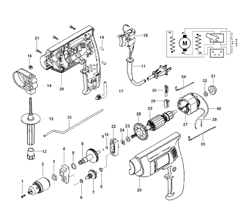 Reverse Screw 2610315857 1Screw 5610836050 1Chuck 2610907641 2Felt Seal 2610017642 3Block 2 610 347 305 4Washer-so 5650871148 5Plain Washer 2610313808 5Washer-so 5650871145 6Washer 2610309996 6Int Gear A 2790577001 7Intermediate Gear 2610357542 7Spindle W/gear 2610352367 8Ball 5700492001 9Ball 2 610 002 144 9Shim 2610347351 10** Ec182**discontinued - Power Cord 1619X00506 11Handle Cap 2610347365 12Not Available 96100 13Clamp 2610372068 14Nut 2610372067 16Chuck Wrench 2610304970 17Chuck Key 3860181001 17Switch Vsr 4870797001 18On-off Switch 2 610 346 618 18Plug 2 610 028 780 19Housing Assembly 2610357532 20Screw 2610326578 21Bearing Housing 2 610 352 355 22Washer 2 610 027 445 23Washer 2 610 026 126 24Armature 2610352027 25Fan 2 610 346 332 26Field 120v 2 610 315 863 27Carbon Brush Holder 2610320548 29Brush Holder 2800303009 29Brush Set 2610321617 30Bushing 2 610 351 348 31Washer 2610029973 32Depth Gauge 2610309525 33Connecting Wire 130 Mm Black 2 610 039 904 34Cable 4810379002 35Connecting Wire 50 Mm 2 610 320 494 35Cable 2610038675 39Connecting Cable Brown 2 610 038 922 40