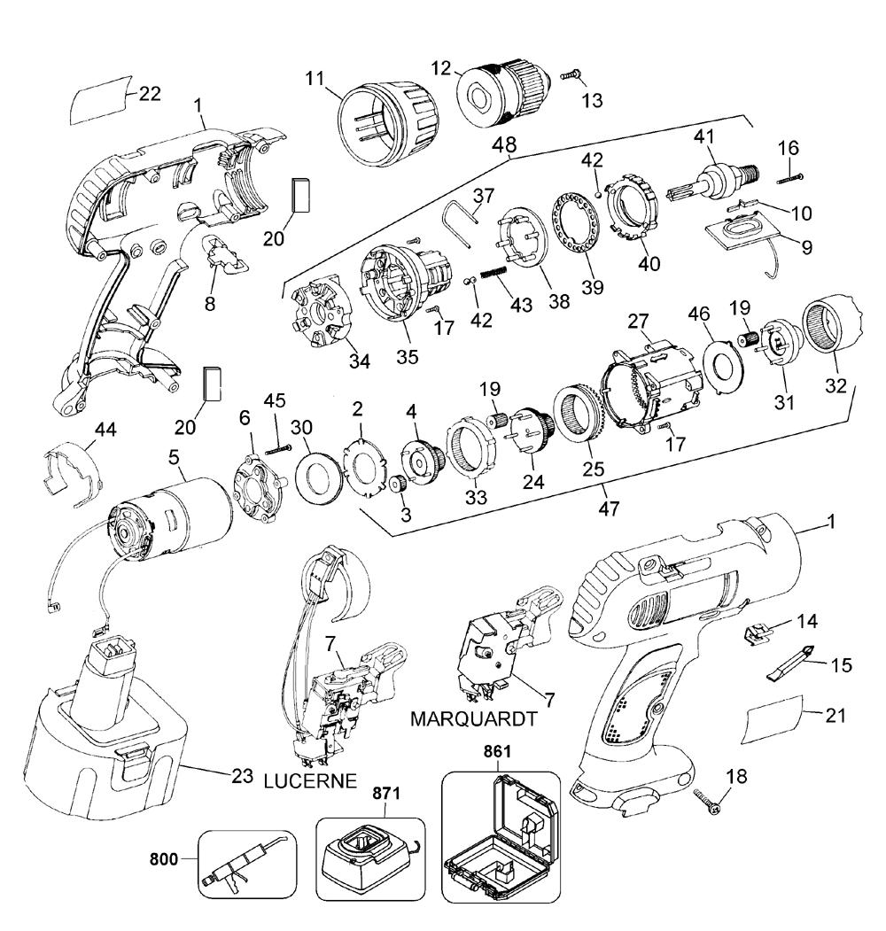 Housing Assy 151755-00 1Washer,retain. 798954-00 2Gear,planet 151936-03 3Carrier,1 Red. 381153-03 4Motor & Pinion 391886-00SV 5Adapter 151336-00 6Switch- V.s.r. 152274-19SV 7Kit,switch Rplm 285348-00 7Button,rev. 151296-00 8Shifter 153281-03 9Spring 144658-00 10Cl Adj Collar 387068-00 11Keyless Chuck 330075-85 12Screw 149518-01 13Bit Clip 148354-03 14Screwdriver Bit 607918-41 15Screw 330019-00 16Screw 098091-10 17Screw,plastite 330019-04 18Gear,planet 2nd 372274-00 19Pad 150844-00 20Nameplate 152549-06 21Id Label 395657-00 22Battery Pack N084519 23Carrier 372272-02 24Gear,ring 2-red 805068-01 25Case,gear 798701-00 27Seal,foam 152482-00 30Carrier,output 805070-02 31Gear,output 392755-00 32Gear,ring 1-red 805063-03 33Cap,end 380976-00 34Housing Assy 798966-01 35Clip,bearing 798959-00 37Nut,adjusting 798709-00 40Ball 386690-00 42Spring 152347-00 43Ring,motor 153033-00 44Screw,taptite 156179-01 45Plate, Thrust 798689-00 46Transmission 380264-07 47Mechanism,cltch 631820-00 48Grease,molykote 284778-00 800Kitbox 652211-00 8611 Hour Charger 388683-12 871