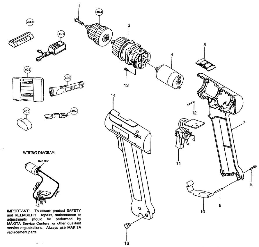 Hex Socket Head Bolt M5x21, 6043d 265998-0 1Gear Assy, 6226dwe 125087-2 3Dc Motor 629726-1 4Dc Motor,6096dwe 629778-2 4Speed Change Lever, 6343dwae 125091-1 5Housing Set, 6096dwe 183016-1 7Tapping Screw Pt3x16, 6233dwa 266130-9 8Pin 3, 6018dw 256252-3 9Set Plate, Ml702 344549-3 10Switch, 6096dwe 651966-3 11Switch, 6096dwe 531079-5 11Leaf Spring, 6096dwe 232182-2 12P.h. Screw M3x6, 6261dwple 911003-8 13Housing Set, 6096dwe 183016-1 14Rubber Pin 6, 6018dw 263022-3 16Battery 9000 (9.6v) 632007-4 400Rule Holder Assy (with Fig. 52) 113103-2 401Plastic Tool Case, 6096dwle 824535-5 402Plastic Tool Case, 6096dwe 824516-9 402Flashlight,6096dwle ML902 403Battery Cover, 6222dwe 414938-7 405+- Bit 2-45 784614-0 406
