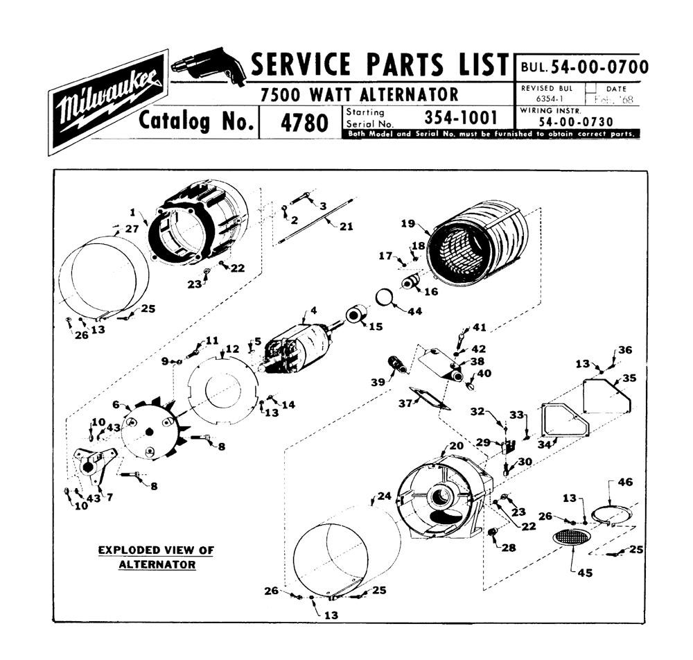 Housing Adaptor 42-04-0210 17/16 06-97-2700 27/16 -14x 2 1/4 Hex. Hd. Capscrew 06-75-5200 3Rotor Assembly 23-40-0180 4#15 Woodruff Key 06-42-0300 5Fan And Rotor Support 22-84-0340 6Engine Shaft Adaptor 42-04-0220 73/8-16x2 06-75-4800 8 06-97-2650 93/8-16 Hex. Nut 06-55-2400 105/16-18x3/4 Soc. Hd. Capscrew 06-75-3950 11Baffle 42-14-0110 12Lockwasher 06-97-2200 1310-32x3/8 Rd. Hd. Screw 06-81-4650 14Ball Bearing 02-04-2555 15Slip Ring 44-90-0230 16Switch Lockwasher - No. 6 Internal 06-97-1800 176-32 Hex Nut 06-55-0600 18Stator Assembly (man. Start) 23-58-0200 19Rear Housing 43-76-0180 20Stud 41-58-0170 211/4 Split Ring Lock Washer 06-97-4050 221/4 - 20 Hex Nut 06-05-1500 23Alternator Strap 43-76-0190 24