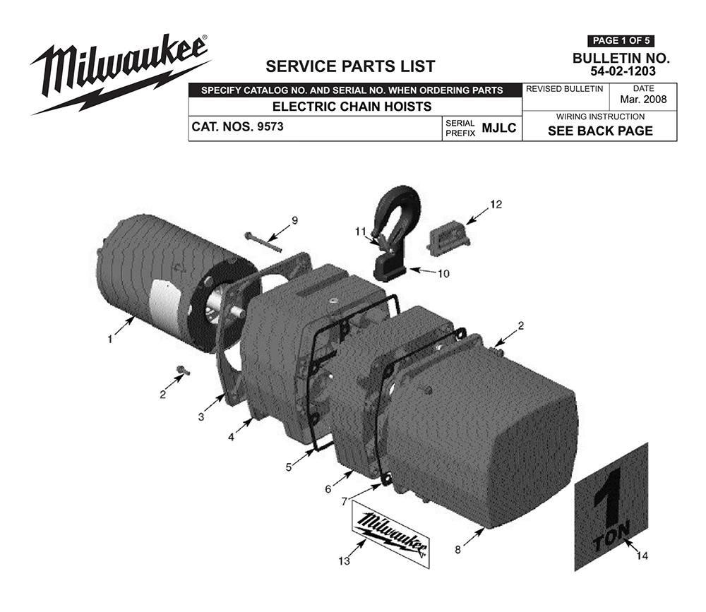 Screw Chain Guide 06-95-0095 2Trim Cover 42-92-1345 3Transmission Housing 43-76-0495 4Transmission Gasket 43-44-0825 5Transmission Cover 42-92-0675 6Electric Cover Gasket 43-44-0835 7Electric Cover 22-68-0235 8Hook Rtnr Scr 1/4x3pl 06-95-5715 9Top Hook W/latch Rigid 14-36-0145 10Latch Kit 14-47-0145 11Hook Retainer Screw 44-86-0670 12Milwaukee Label 10-37-0070 132 Ton Decal 10-37-0065 14